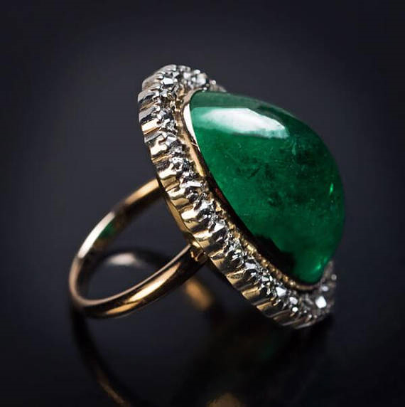 CA$26,382.36 Description This antique ring from the early 1900s features a big cabochon cut natural emerald of a nice color surrounded by old cushion cut diamonds (H-I color, SI clarity) set in silver over 14K gold. The emerald measures 21.2 x 13 x 9.3 mm and is approximately 19.17 ct. Estimated total diamond weight is 2.20 ct. Ring size 7.25 (18 mm) sizable